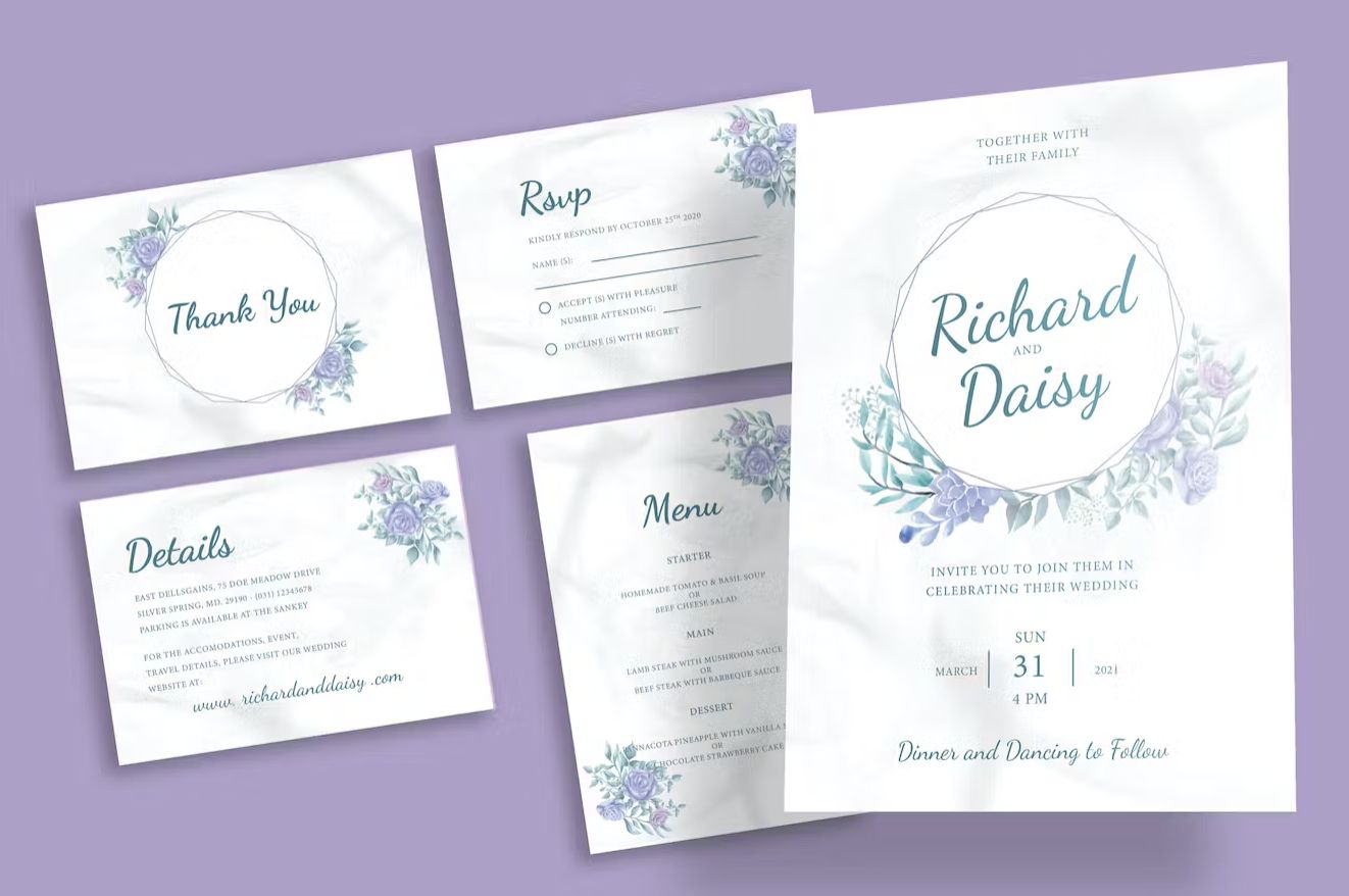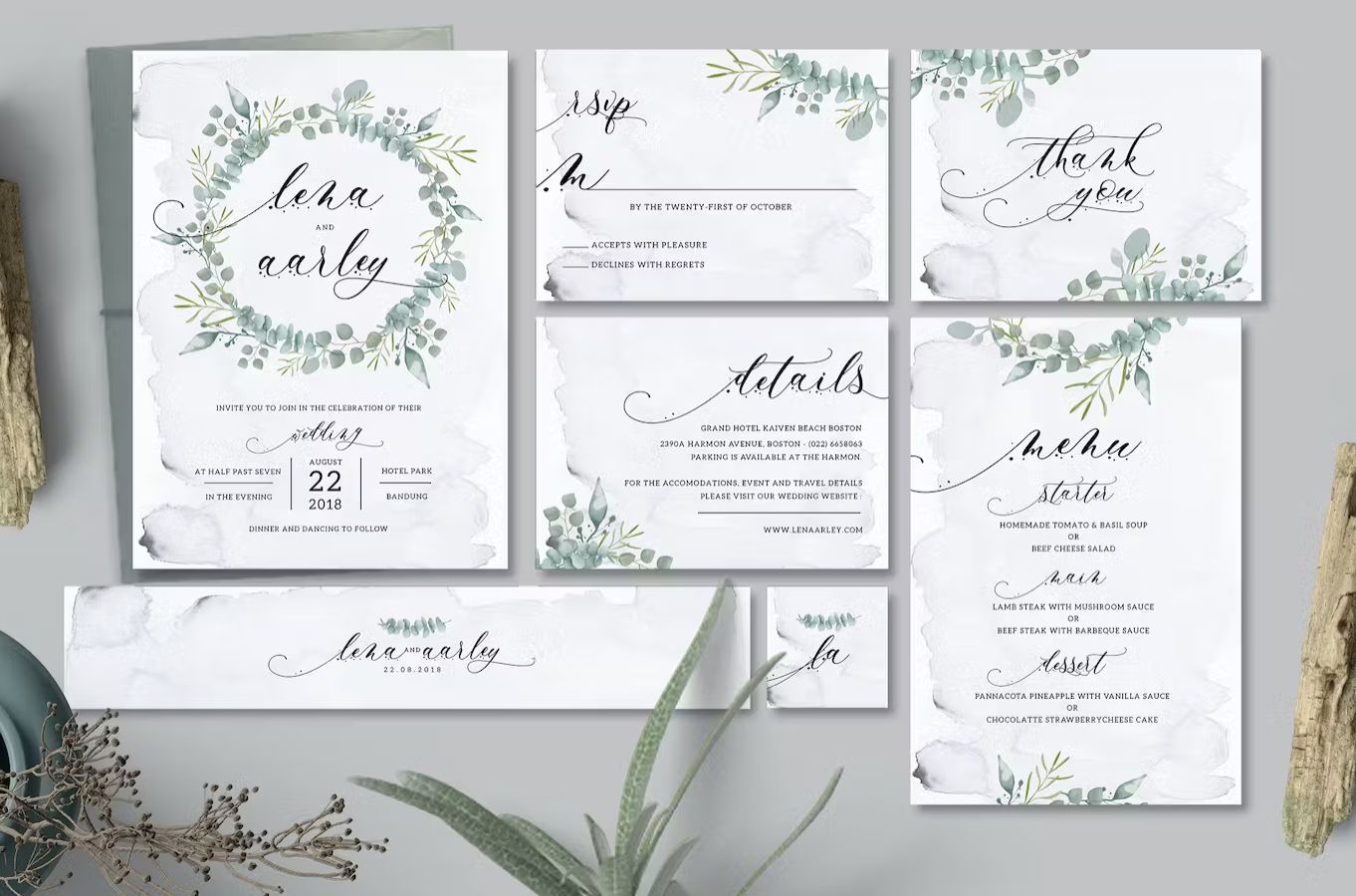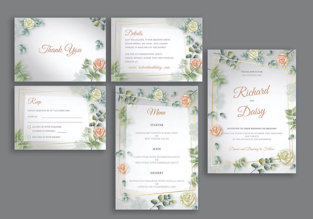 Completa tu Web con los diseños más exclusivos en invitaciones físicas, menús, destacados de mesas, tarjetas detalles, etc.